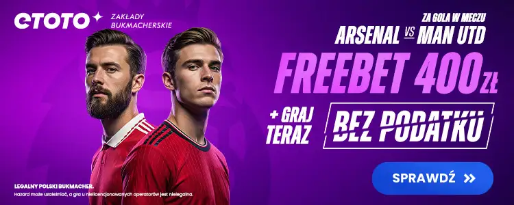 Promocja przygotowana przez ETOTO na to spotkanie jest przykładem oferty typu „bonus za gola”, która cieszy się dużą popularnością wśród nowych użytkowników. Mechanizm jest prosty i przejrzysty, a warunki nie wymagają skomplikowanego obrotu środkami. Freebet ETOTO o wartości 400 zł można wykorzystać na dowolne zakłady bukmacherskie dostępne w ofercie operatora, bez podatku od stawki.