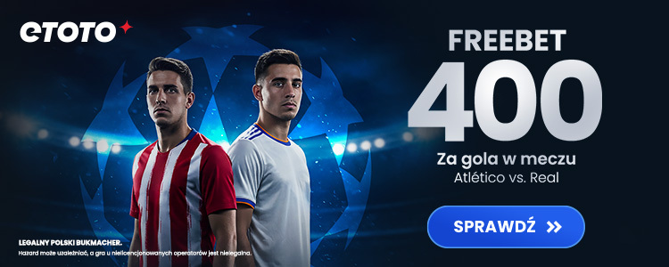 Zarejestruj się z kodem TYPYMF w dniu meczu i dokonaj depozytu minimum 50 zł, aby odblokować Mega Freebet o wartości 400 zł. Zagraj zakład specjalny na gola w meczu Atletico Madryt vs. Real Madryt – postaw dokładnie 1 zł. Jeśli w spotkaniu padnie min. 1 bramka, otrzymasz Freebet 400 złotych!