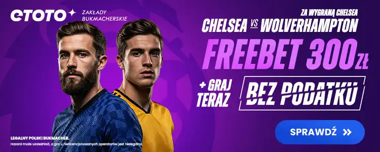 - Jeśli Chelsea wygra, otrzymasz Freebet 300 zł – do wykorzystania na dowolne zakłady w ofercie ETOTO.