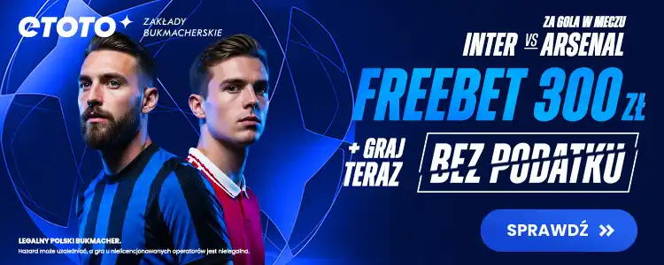 Zarejestruj się w dniu meczu z kodem TYPYMF i wpłać minimum 20 zł, aby odblokować Mega Freebet 300 zł i grać bez podatku. Zagraj zakład specjalny za 1 zł na gola w meczu Inter Mediolan – Arsenal. Jeśli w spotkaniu padnie minimum jedna bramka, otrzymasz Freebet 300 zł.