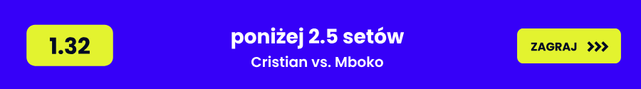 - Typ 2 – Poniżej 2.5 setów (kurs 1.32) — kurs poparty tendencją do krótszych spotkań w przypadku dominacji Mboko.