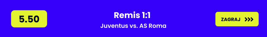 - Remis 1:1 (kurs 5.50) – Charakter meczu, defensywny styl obu drużyn i ostatnie bezpośrednie spotkania wskazują na bardzo wyrównany pojedynek. Taki wynik często pojawiał się w starciach Juventusu z Romą, szczególnie przy zachowawczej grze obu zespołów.