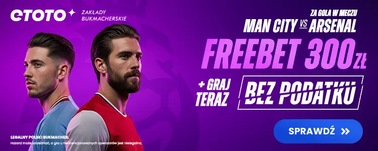 Zarejestruj się 19.04.2026 (w dniu meczu) z kodem TYPYMF i wpłać minimum 20 zł, aby odblokować Mega Freebet 300 zł i grać bez podatku. Zagraj zakład specjalny za 1 zł na gola w meczu Manchester City – Arsenal. Jeśli w spotkaniu padnie minimum jedna bramka, otrzymasz Freebet 300 zł.