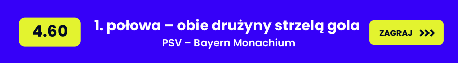 - 1. połowa – obie drużyny strzelą gola (4.60) – PSV u siebie gra bardzo ofensywnie i średnio zdobywa ponad 2 gole na mecz, a Bayern Monachium regularnie wchodzi w spotkania z wysoką intensywnością i szybko dochodzi do sytuacji bramkowych. Przy wysokim tempie od pierwszych minut i problemach PSV w defensywie, realne jest otwarte pierwsze 45 minut, w których oba zespoły znajdą drogę do siatki.