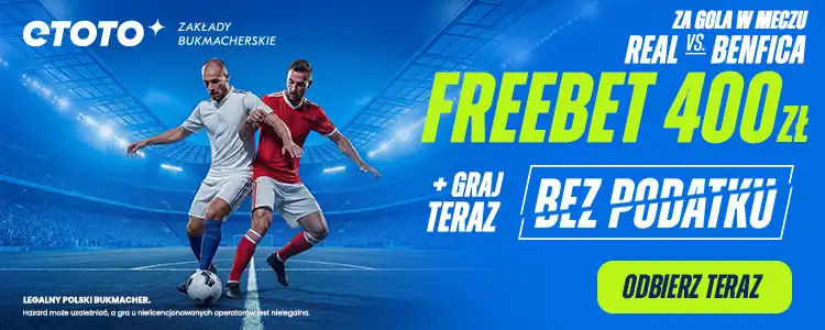 W środę, 25 lutego 2026 roku o godzinie 21:00, Estadio Santiago Bernabéu w Madrycie stanie się areną decydującego, rewanżowego starcia 1/8 finału Ligi Mistrzów. Real Madryt podejmie Benficę, broniąc skromnej zaliczki z pierwszego meczu. Transmisję z tego elektryzującego widowiska przeprowadzi Canal+ Extra 1. Z tej okazji bukmacher ETOTO przygotował dla nowych graczy fenomenalną ofertę – używając kodu TYPYMF, wystarczy, że w meczu padnie zaledwie jeden gol, a na Twoje konto trafi aż 400 zł freebetu!